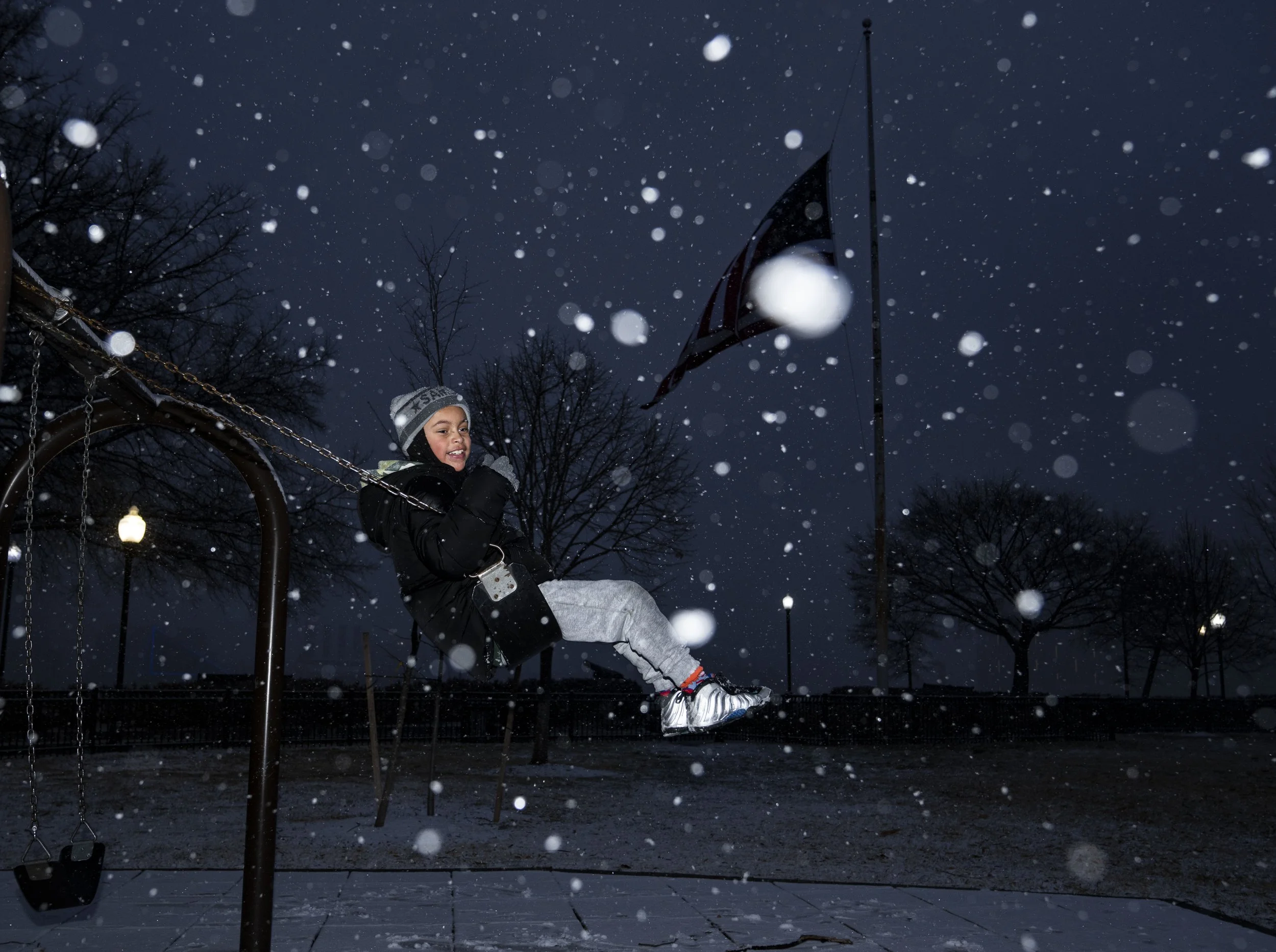 Jason Hagan, 8, of Baltimore swings at Federal Hill Park as snow begins to fall.